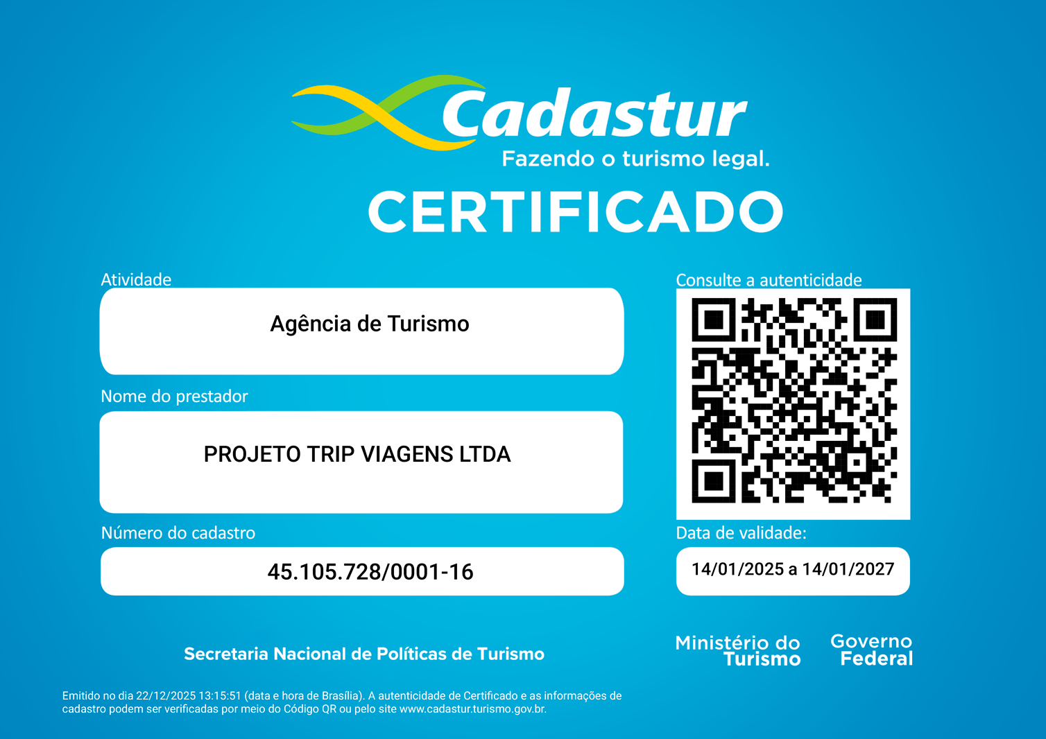O Projeto Trip é uma empresa de turismo especializada em grupos de viagens internacionais, atuando desde 2021. Certificada pela Cadastur, oferece experiências seguras e bem planejadas, com acompanhamento completo. A agência conta com sede física em Nova Odessa – SP, conectando pessoas a destinos incríveis ao redor do mundo.
